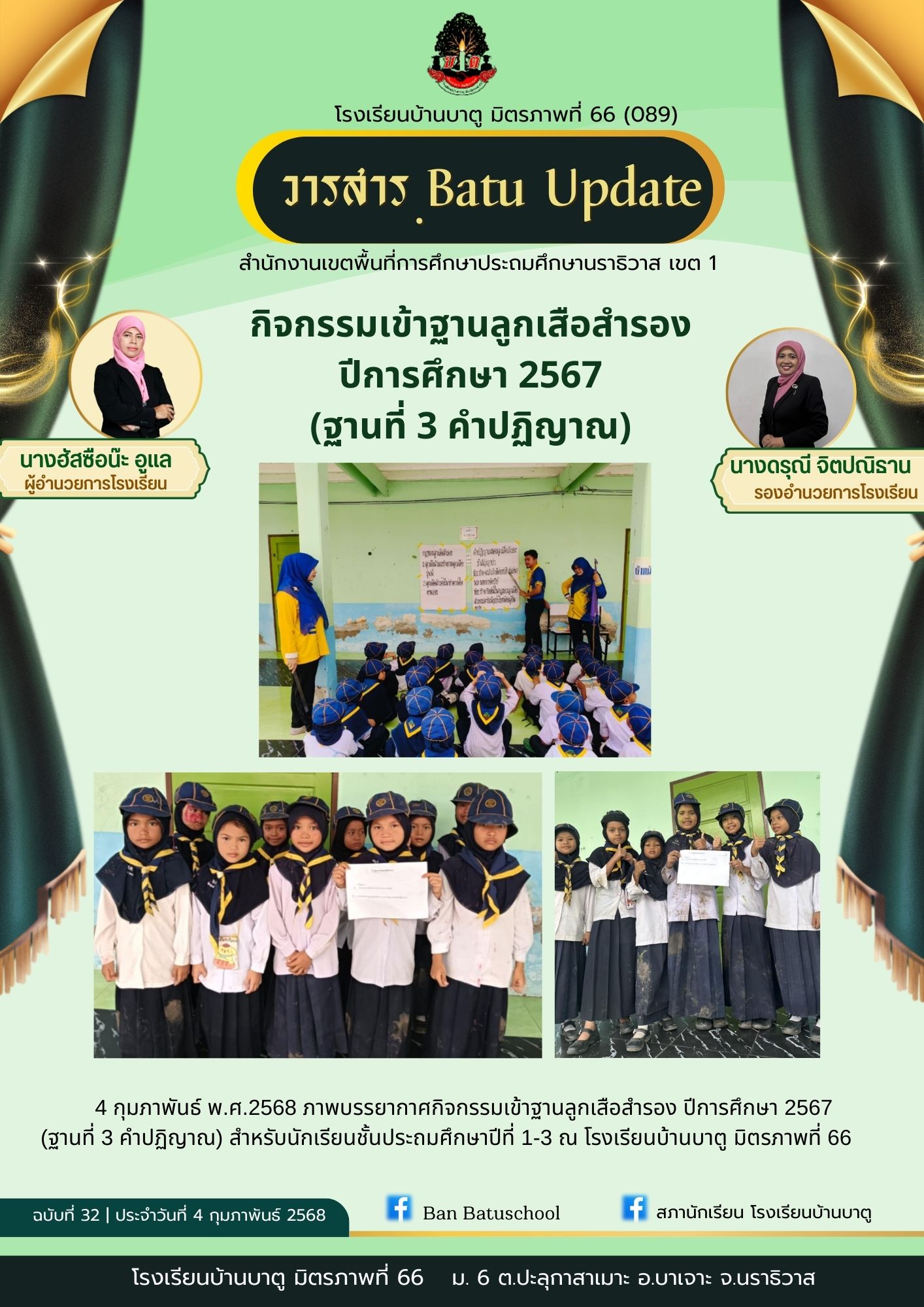 4 กุมภาพันธ์ พ.ศ.2568 ภาพบรรยากาศกิจกรรมเข้าฐานลูกเสือสำรอง ปีการศึกษา 2567 (ฐานที่ 3 คำปฏิญาณ) สำหรับนักเรียนชั้นประถมศึกษาปีที่ 1-3 ณ โรงเรียนบ้านบาตู มิตรภาพที่ 66