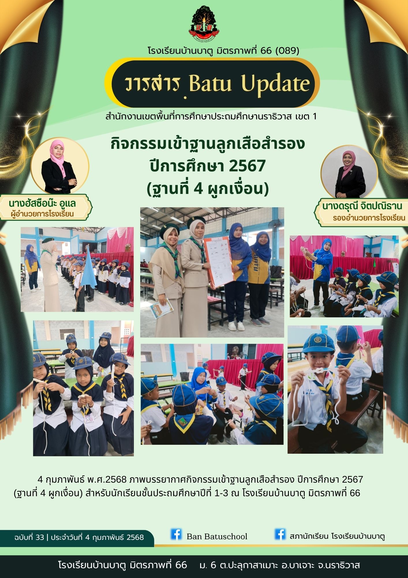 4 กุมภาพันธ์ พ.ศ.2568 ภาพบรรยากาศกิจกรรมเข้าฐานลูกเสือสำรอง ปีการศึกษา 2567 (ฐานที่ 4 ผูกเงื่อน) สำหรับนักเรียนชั้นประถมศึกษาปีที่ 1-3 ณ โรงเรียนบ้านบาตู มิตรภาพที่ 66